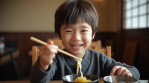 流しそうめんの楽しさと、食べ物を自分でキャッチする達成感を全身で味わっていました。